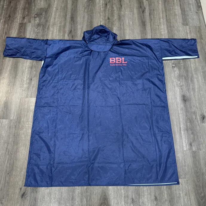 Áo mưa trùm người, có mũ che chắn, màu đỏ và xanh navy nổi bật. In logo BBL build better life sắc nét, vừa tiện dụng vừa mang lại giá trị quảng bá thương hiệu.
