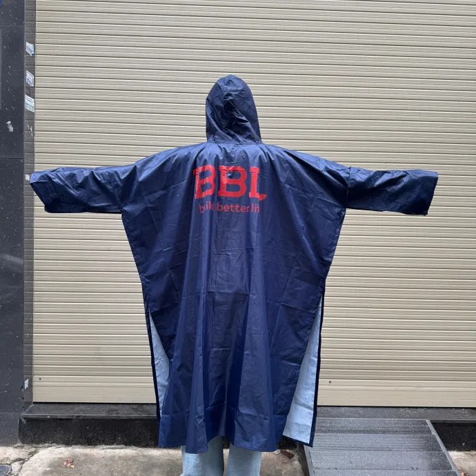 Áo mưa trùm người BBL build better life màu đỏ và xanh navy, thiết kế rộng rãi, có mũ che kín, in logo thương hiệu nổi bật. Phù hợp làm quà tặng khách hàng, nhân viên, sự kiện ngoài trời.
