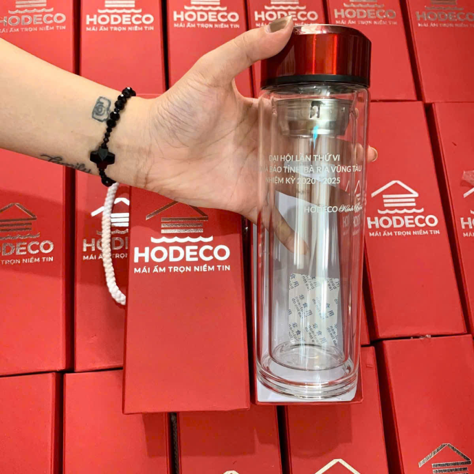Bình thủy tinh 2 lớp có lọc trà là dòng bình cao cấp, thiết kế trong suốt hiện đại, nắp kim loại sáng bóng và bộ lọc trà inox tiện lợi. Sản phẩm đặc biệt phù hợp cho quà tặng doanh nghiệp, hội nghị, các sự kiện kỷ niệm, với khả năng in logo, slogan và thông điệp riêng theo yêu cầu.