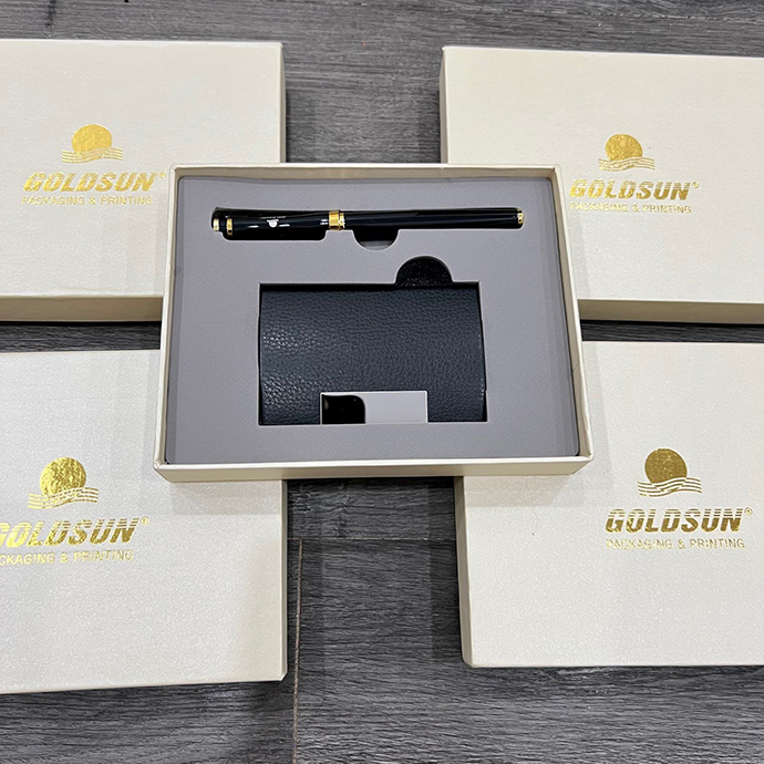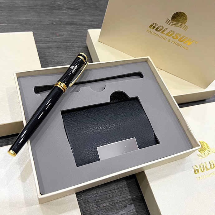 - Bộ Gift 2 món gồm: bút kim loại cao cấp khắc logo, ví đựng namecard khắc logo.