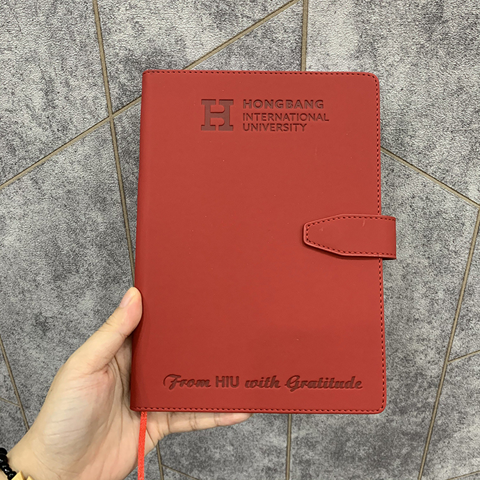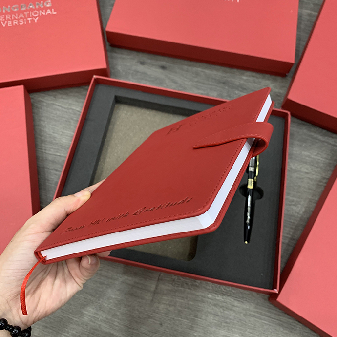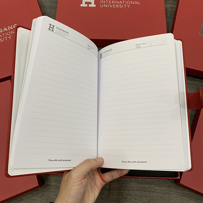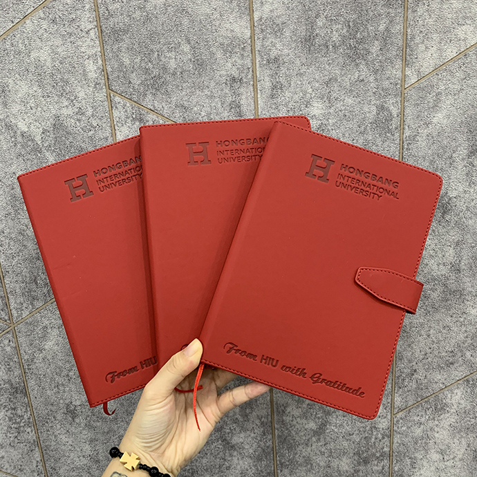 - Bộ Gift gồm sổ bìa da, bút kim loại dập logo Đại học Hồng Bàng