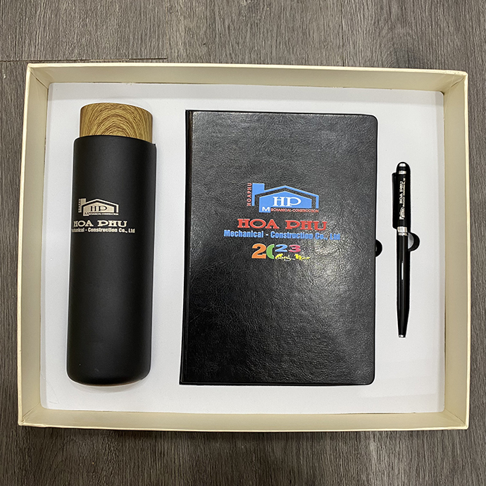 Bộ gift 3 món Bình Giữ Nhiệt - Sổ Tay - Bút Bi in logo Hoà Phú là món quà tặng lý tưởng dành cho các doanh nghiệp muốn gửi tặng khách hàng, đối tác hoặc nhân viên một bộ quà tặng vừa tiện ích vừa mang tính quảng bá thương hiệu hiệu quả. Bộ sản phẩm này không chỉ giúp người nhận sử dụng trong cuộc sống hàng ngày mà còn tạo ấn tượng mạnh mẽ với hình ảnh doanh nghiệp bạn qua những món quà chất lượng.