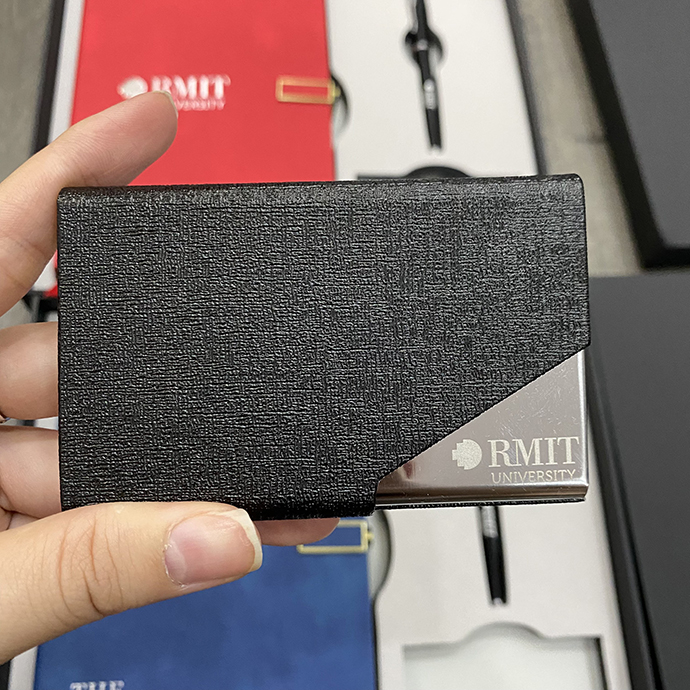 Khắc logo: Khắc laser logo RMIT, tên thương hiệu hoặc thông điệp lên sổ tay, namecard holder và bút kim loại.