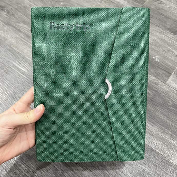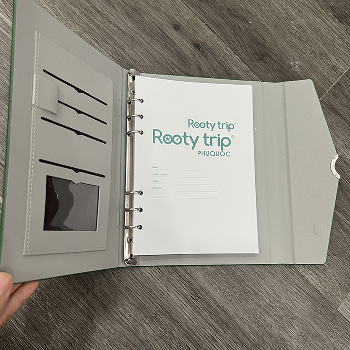 - Bộ sổ gồm: hộp giấy có mút, sổ tay, bút, móc khoá tất cả đèu khắc logo Rootytrip