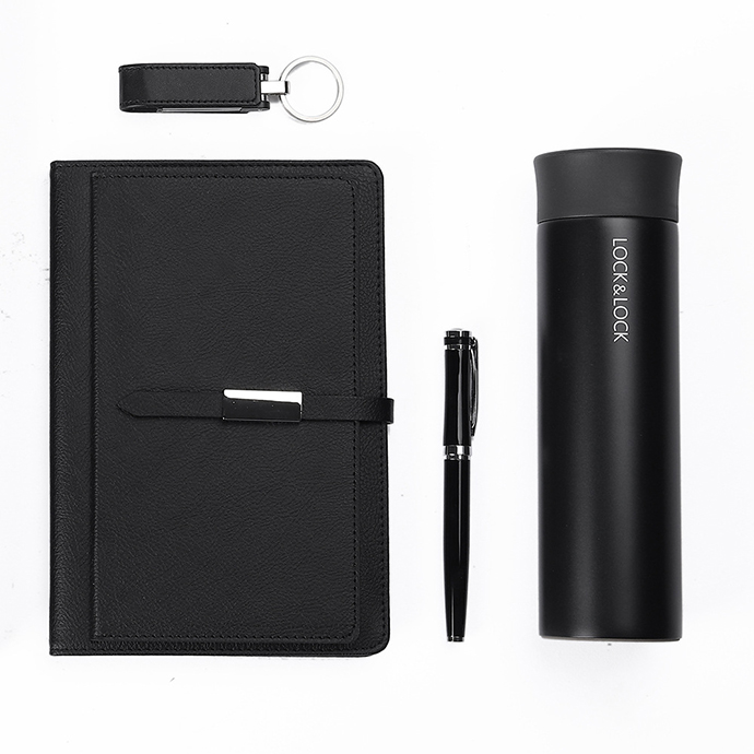 Bộ quà tặng doanh nghiệp gồm sổ tay bìa da cao cấp, bình giữ nhiệt Lock&Lock, bút kim loại và móc khoá khắc logo, thiết kế sang trọng – đồng bộ – phù hợp làm quà tri ân khách hàng, đối tác và nhân sự.