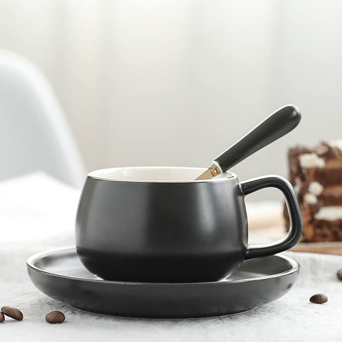 Bộ ly cà phê cao cấp gồm ly Cappuccino kèm dĩa và muỗng, ly Latte có muỗng và nắp, thiết kế sang trọng, thích hợp làm quà tặng doanh nghiệp, khách hàng và đối tác.
