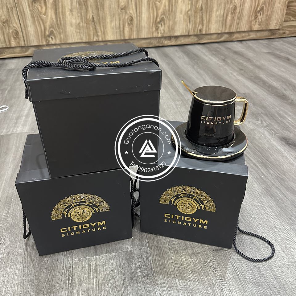 Bộ ly sứ màu đen kèm dĩa lót viền vàng in logo CITIGYM là món quà tặng doanh nghiệp cao cấp, vừa tinh tế vừa sang trọng, thích hợp làm quà tặng cho khách hàng, đối tác hay trong các sự kiện quan trọng.