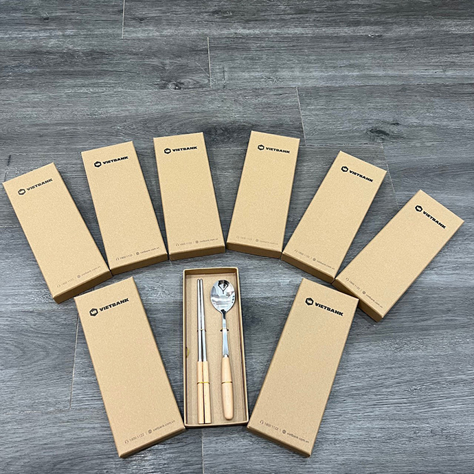 Bộ muỗng đũa inox cán gỗ gồm 1 đôi đũa và 1 muỗng, thiết kế gọn gàng, tinh tế, phù hợp làm quà tặng doanh nghiệp in hoặc khắc logo theo yêu cầu. Sản phẩm đi kèm hộp carton sang trọng, thuận tiện đóng gói và sử dụng hằng ngày.