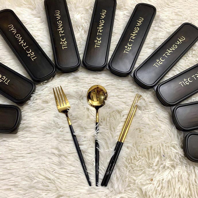 Bộ muỗng đũa cao cấp có in chữ Tiệc Trăng Máu ngoài hộp