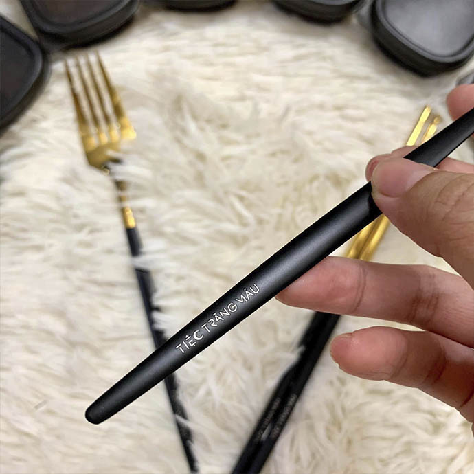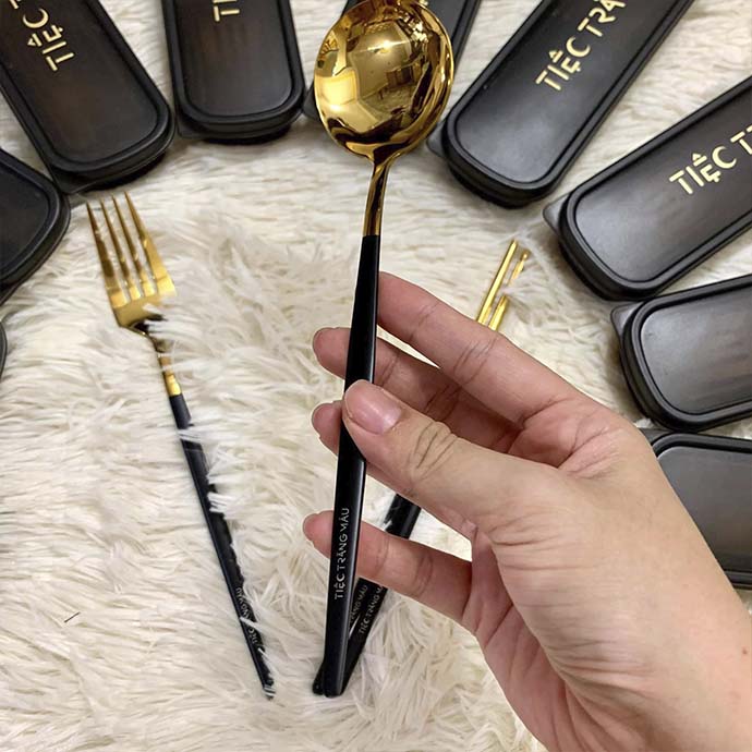 Sản phẩm gồm muỗng, nĩa và đũa viền vàng được thiết kế đồng bộ, mang phong cách tối giản nhưng sang trọng, phù hợp với nhiều không gian sử dụng.
