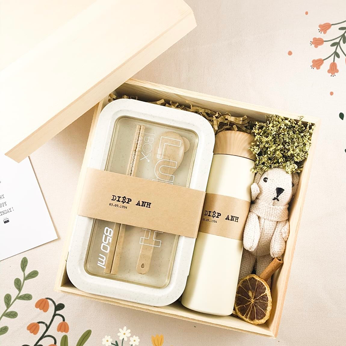 ✅ Thiết kế đồng bộ, sang trọng – Bộ quà gồm bình nước + bộ muỗng đũa + túi vải giúp tạo sự chuyên nghiệp và tinh tế.