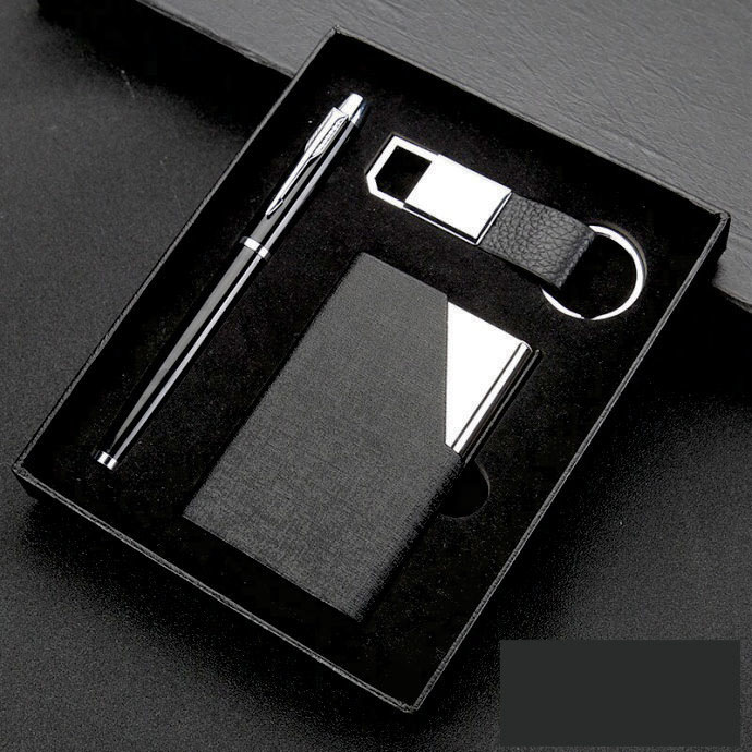 Bộ quà tặng doanh nghiệp 3 món cao cấp gồm bút ký, hộp đựng danh thiếp và móc khóa da PU – là lựa chọn lý tưởng để tri ân khách hàng, tặng đối tác hoặc nhân viên. Thiết kế sang trọng, đồng bộ màu đen bạc tinh tế, thể hiện đẳng cấp thương hiệu và sự chuyên nghiệp của doanh nghiệp.