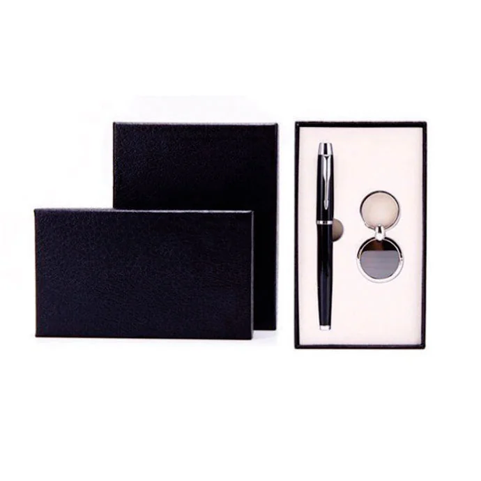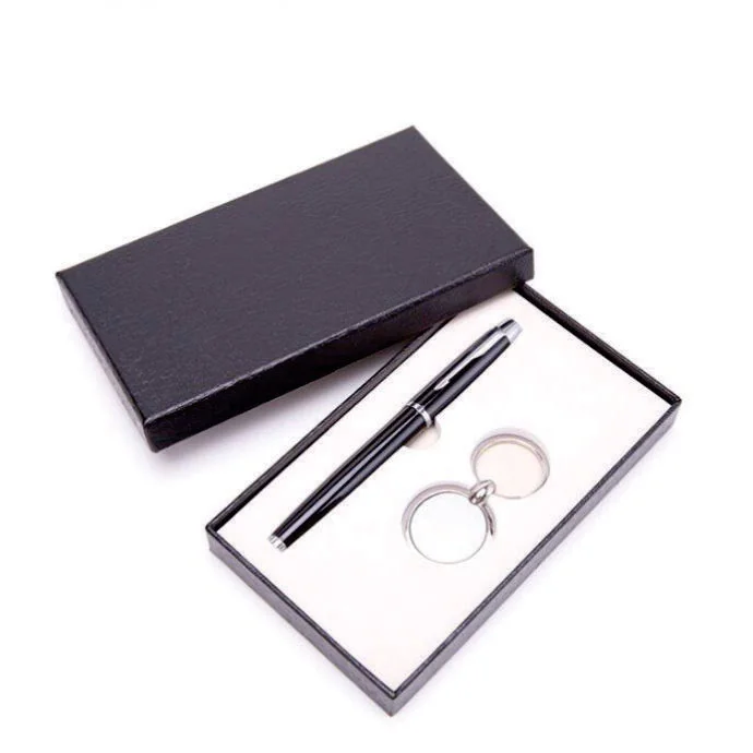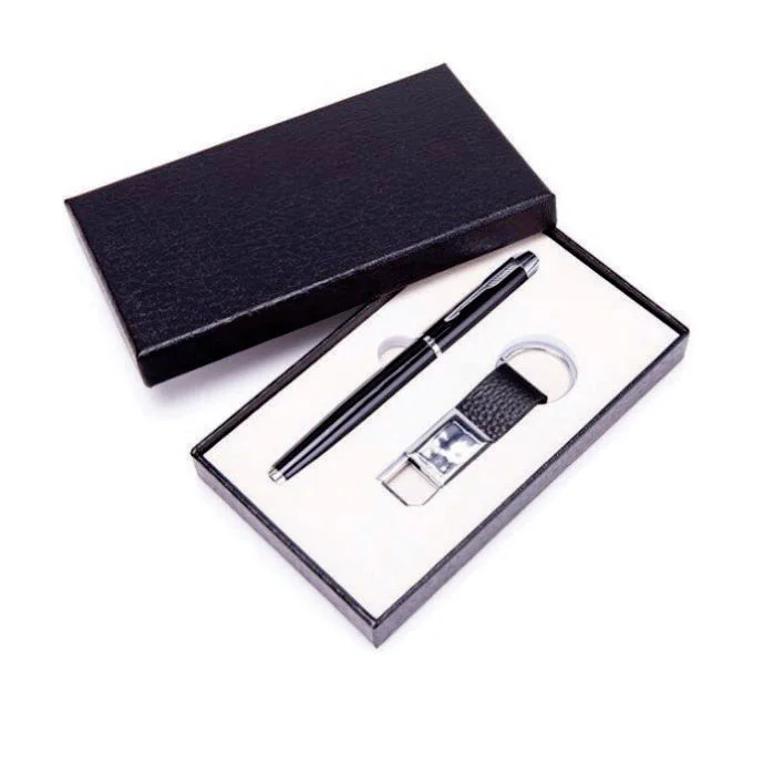 Hộp được bọc da giả cao cấp hoặc giấy nhung đen mịn, phối với khay mousse định hình chắc chắn. Bên trong bố trí gọn gàng: 1 bút ký kim loại và 1 phụ kiện (USB hoặc móc khóa) tạo nên tổng thể cân đối và đẳng cấp.