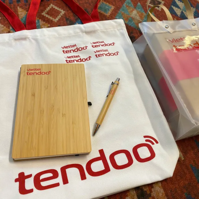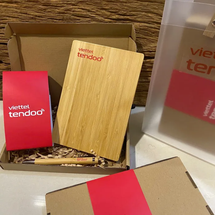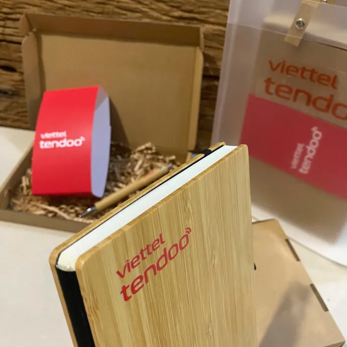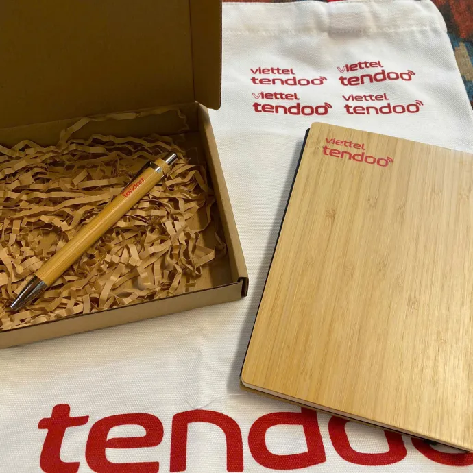 Bộ quà tặng doanh nghiệp gồm sổ bìa tre, bút in logo và túi vải thân thiện môi trường là lựa chọn tinh tế và chỉn chu để tặng khách hàng, đối tác và nhân viên. Thiết kế tối giản, sang trọng, đồng nhất nhận diện thương hiệu.