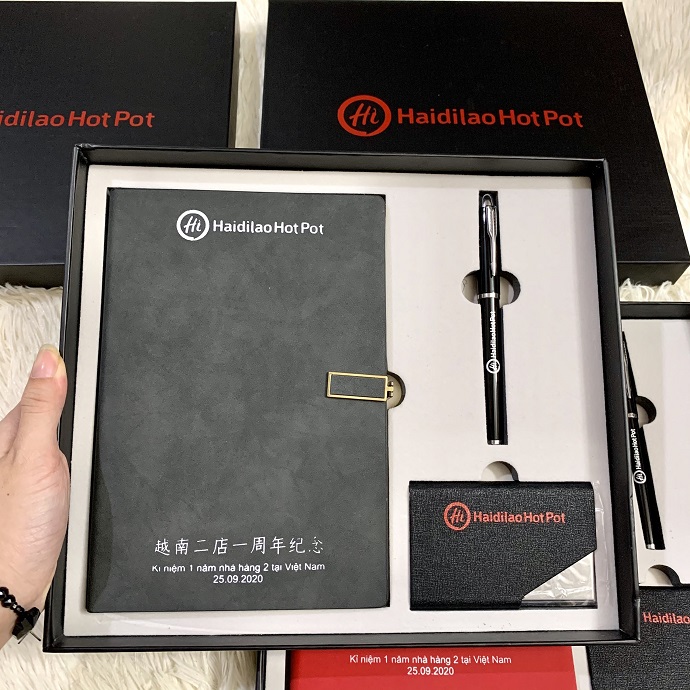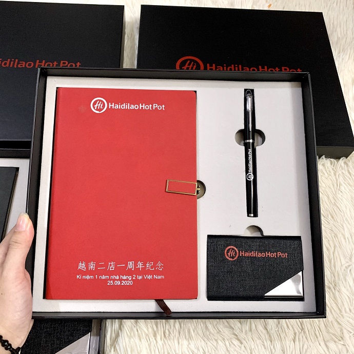 Bộ quà tặng gồm sổ tay bìa cứng, bút ký kim loại và ví đựng namecard, được đặt trong hộp cứng sang trọng. Đây là lựa chọn phổ biến của các doanh nghiệp khi muốn tri ân khách hàng hoặc tạo dấu ấn trong các sự kiện đặc biệt.