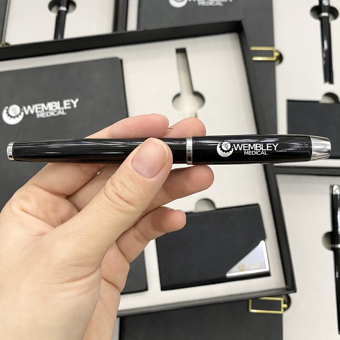 Bộ sổ tay bìa da màu xám đi cùng bút và card visit mang đến sự đồng bộ, sang trọng và đẳng cấp. Tông màu xám hiện đại phù hợp với nhiều ngành nghề và dễ dàng nổi bật khi in logo.