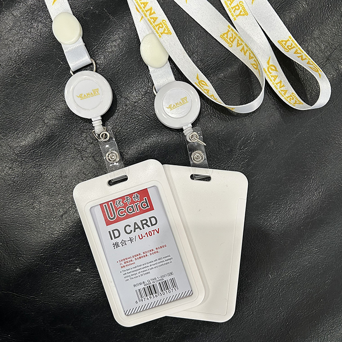 Dây đeo thẻ màu trắng in chữ vàng nổi bật, kèm cuộn rút và bao đựng thẻ tiện lợi. Phù hợp cho nhân viên, học sinh – sinh viên, sự kiện và hội thảo.