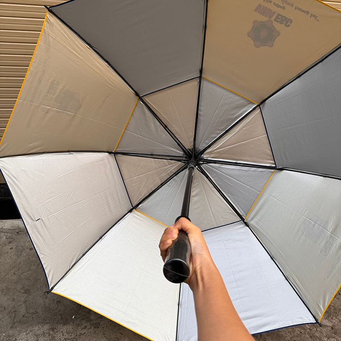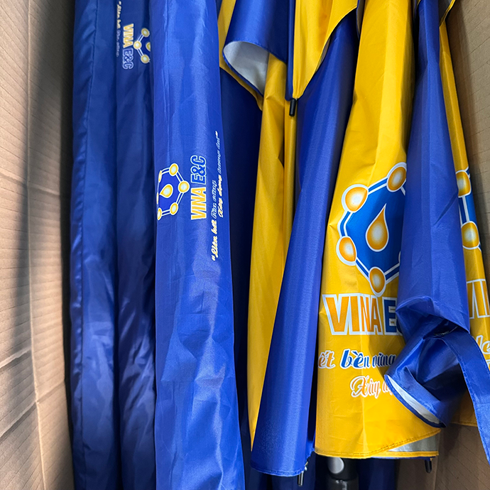 Ô dù cỡ lớn phối màu xanh – vàng, in logo VINA E&C sang trọng. Sản phẩm giúp che mưa nắng hiệu quả, đồng thời nâng cao hình ảnh thương hiệu trong mắt khách hàng và đối tác.