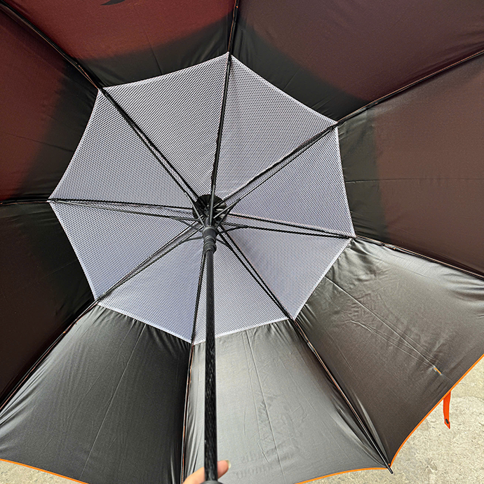 Ô dù cỡ lớn màu cam nổi bật, chất liệu vải dù bền chắc, in logo Paradis de L’amour sang trọng. Thiết kế khung chắc chắn, che mưa nắng hiệu quả, phù hợp làm quà tặng sự kiện, khách hàng.