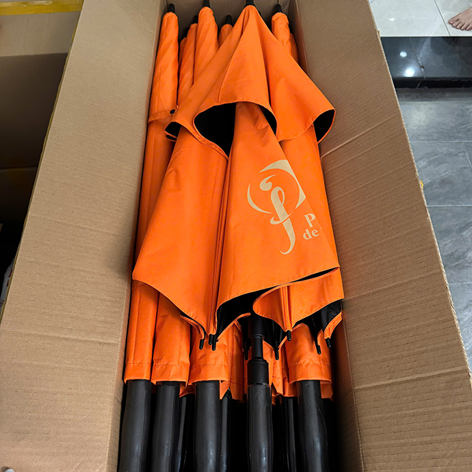 Ô dù cỡ lớn màu cam tươi, in logo Paradis de L’amour, mang lại sự tiện lợi và giá trị quảng bá thương hiệu. Sản phẩm thiết kế bền chắc, sang trọng, phù hợp cho khách hàng và sự kiện ngoài trời.