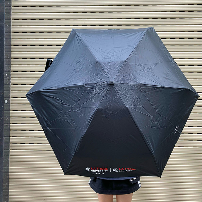 Ô dù gấp gọn màu đen in logo La Trobe University, thiết kế nhỏ gọn, sang trọng, phù hợp làm quà tặng sinh viên, nhân viên, khách hàng. Sản phẩm tiện ích, giúp quảng bá thương hiệu hiệu quả.