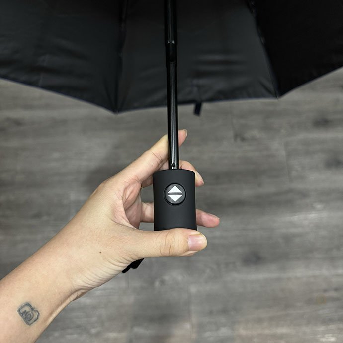Ô dù gấp gọn màu xanh navy, tay cầm nhựa đen chắc chắn, in logo thương hiệu nổi bật. Tiện dụng khi di chuyển, thích hợp làm quà tặng khách hàng, nhân viên, sự kiện.