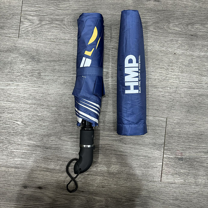 Ô dù gấp 3 in logo HMP 20 năm là món quà vừa thiết thực vừa trang trọng. Với màu xanh dương sang trọng cùng điểm nhấn logo vàng nổi bật, chiếc dù không chỉ giúp che nắng mưa mà còn tạo dấu ấn mạnh mẽ cho thương hiệu.