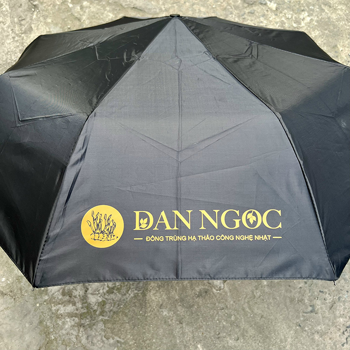 Ô dù gấp 3 màu đen được thiết kế hiện đại, nhỏ gọn, dễ mang theo bên mình. Màu sắc đen huyền bí kết hợp với chi tiết in vàng sang trọng, giúp thương hiệu trở nên nổi bật và chuyên nghiệp hơn trong mắt khách hàng.