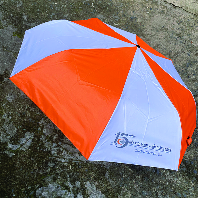 Ô dù cầm tay in logo kỷ niệm 15 năm được thiết kế với gam màu cam – trắng nổi bật, in logo thương hiệu và thông điệp sự kiện. Đây là món quà ý nghĩa dành cho khách hàng, nhân viên và đối tác trong dịp kỷ niệm thành lập công ty.