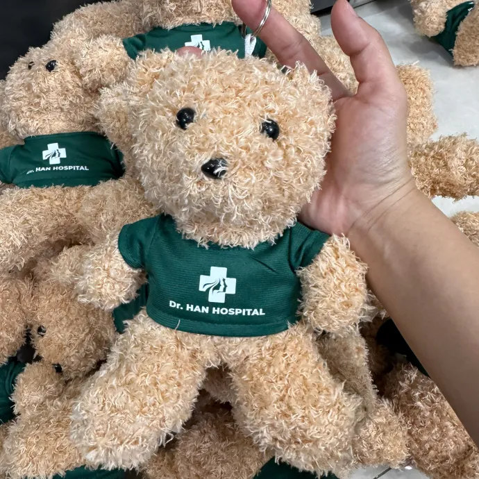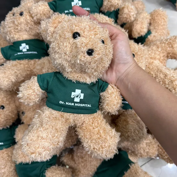 Gấu bông nhỏ nhắn, mềm mại, mặc áo xanh in logo Dr. HAN HOSPITAL. Sản phẩm vừa là món quà tinh thần dễ thương, vừa giúp tăng độ nhận diện thương hiệu bệnh viện.