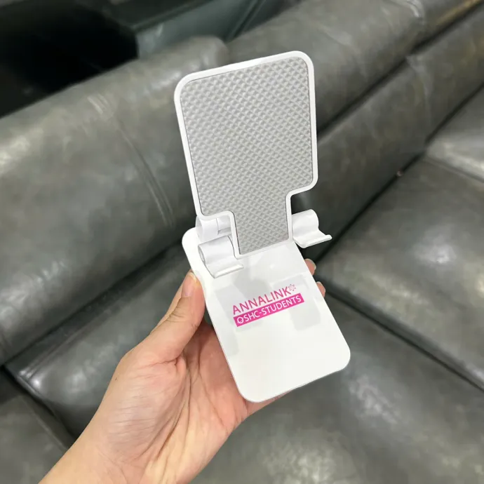 Giá đỡ điện thoại màu trắng với bề mặt chống trượt, in logo Annalink OSHC Students chuyên nghiệp. Sản phẩm gấp gọn, tiện lợi khi học tập, làm việc và giải trí.