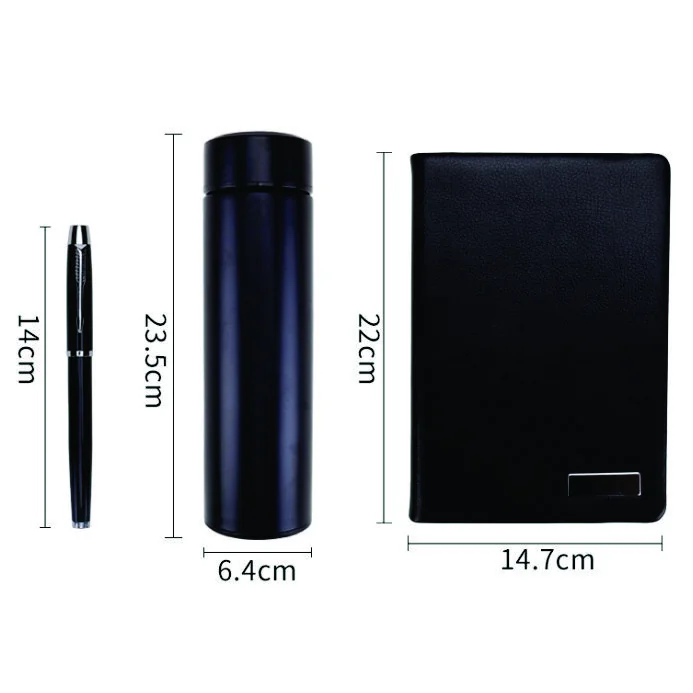 Bộ quà tặng doanh nghiệp cao cấp gồm sổ tay bìa da, bình giữ nhiệt, bút ký sang trọng kèm hộp và túi đựng, phù hợp tặng nhân viên, khách hàng, sự kiện và hội nghị.