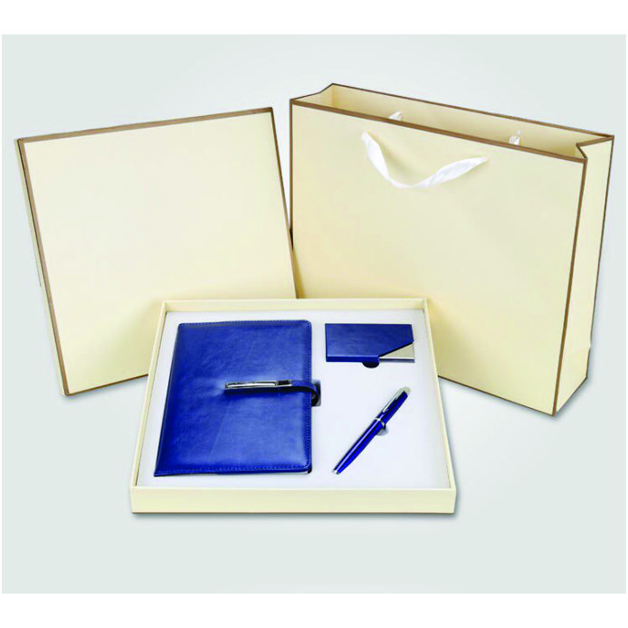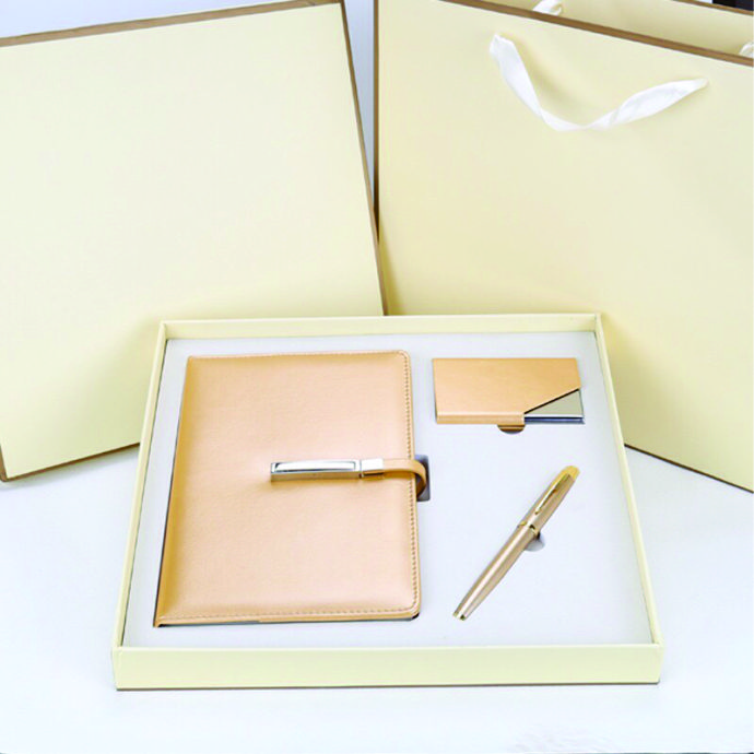 Bộ quà tặng doanh nghiệp màu vàng kem sang trọng gồm sổ tay bìa da, bút ký, hộp đựng danh thiếp, kèm hộp và túi quà cao cấp, thích hợp cho sự kiện, hội nghị và tri ân khách hàng.