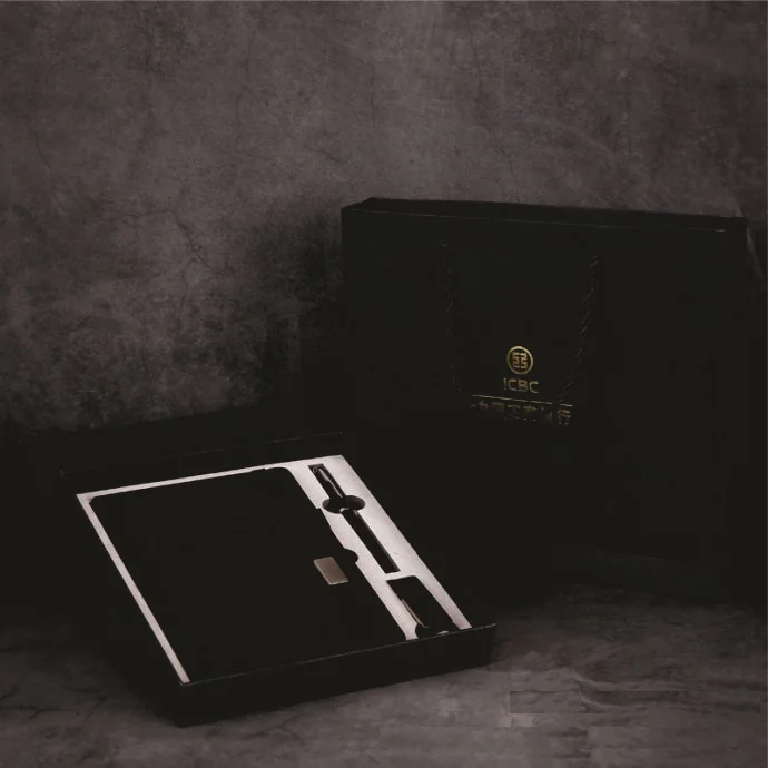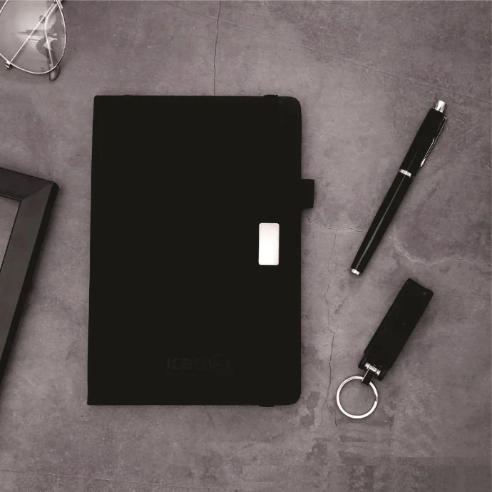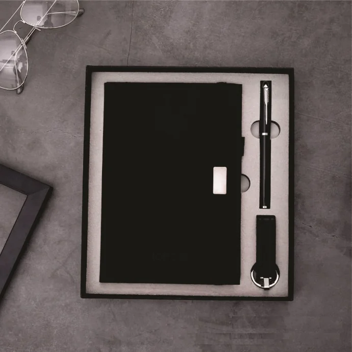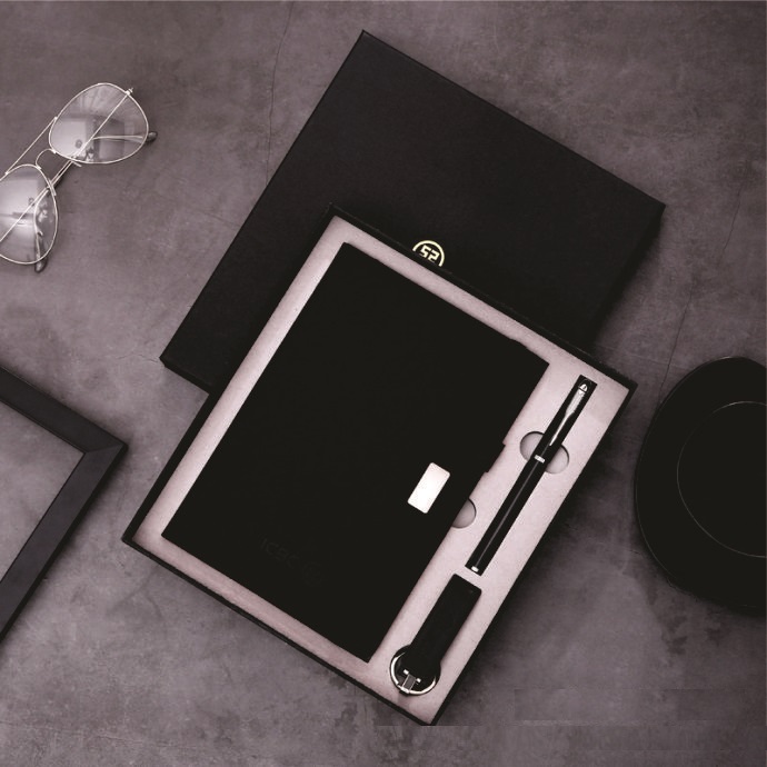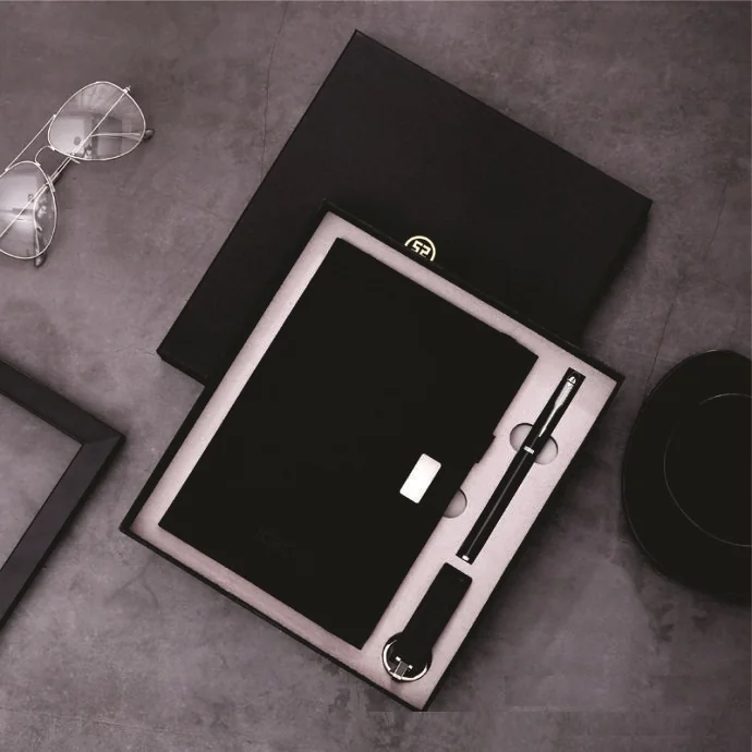 Bộ quà tặng gồm sổ da cao cấp và bút ký kim loại, được sắp xếp tinh tế trong hộp quà sang trọng. Đây là bộ quà mang tính chuyên nghiệp, phù hợp tặng khách hàng, đối tác hoặc nhân viên.