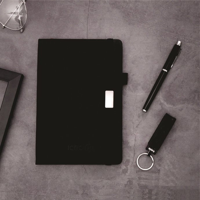Bộ sản phẩm sử dụng tông màu đen chủ đạo, mang phong cách tối giản nhưng đầy tinh tế. Sổ tay da mềm thiết kế gập lịch sự, kết hợp khóa kim loại tạo điểm nhấn sang trọng. Bút ký màu đen – bạc thanh lịch, phù hợp môi trường văn phòng.