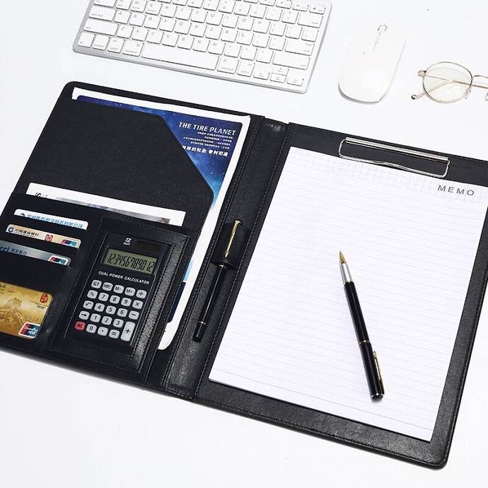 Bộ giftset bìa da kẹp giấy kèm bút và máy tính cầm tay.