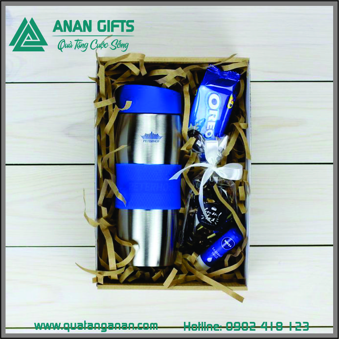 Bộ quà tặng bình giữ nhiệt gồm nhiều vật phẩm, tạo nên một tổng thể thú vị và hấp dẫn .
