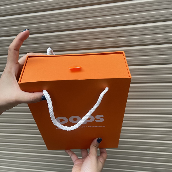 Hộp quà giấy cao cấp dạng túi xách màu cam in logo Pops thiết kế hiện đại, nổi bật, phù hợp làm quà tặng thương hiệu, truyền thông sự kiện và quà lưu niệm doanh nghiệp.