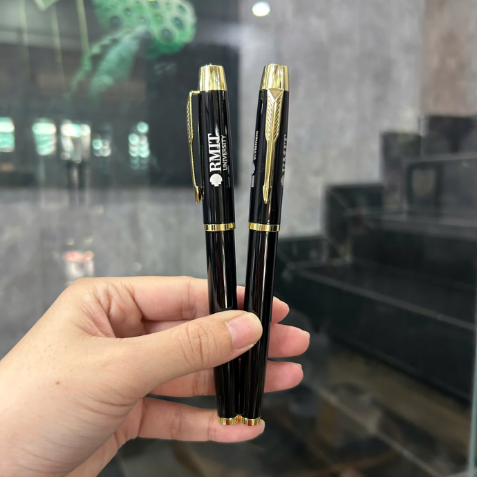 Bút kim loại hoặc bút bi in logo: kiểu dáng thanh lịch, mực trơn đều, phù hợp cho dân văn phòng, doanh nhân.