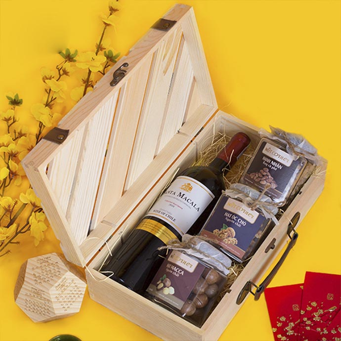 Bộ quà tặng rượu vang cao cấp kết hợp cùng các loại hạt dinh dưỡng chọn lọc, đóng gói trong hộp gỗ sang trọng. Sản phẩm phù hợp làm quà biếu dịp lễ, Tết, tri ân khách hàng và đối tác.