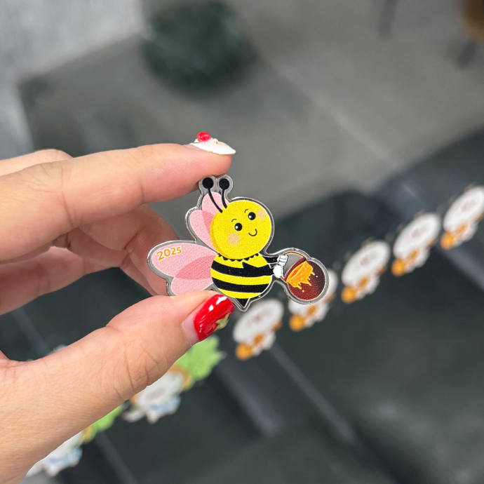 Huy hiệu hình ong dễ thương – chất liệu mica in màu nổi bật, thiết kế đáng yêu, in logo theo yêu cầu. Phù hợp làm quà tặng học sinh, sự kiện trường học, chương trình thiếu nhi.