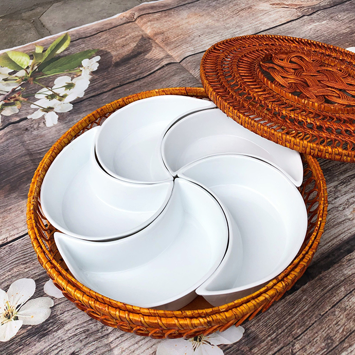 Set dĩa ăn mặt trăng giỏ tre mang đến sự tinh tế và khác biệt trong từng chi tiết. Các dĩa sứ trắng hình mặt trăng ghép lại thành hình tròn tượng trưng cho sự đoàn kết, viên mãn và sung túc – phù hợp làm quà tặng doanh nghiệp trong các dịp lễ Tết hoặc sự kiện tri ân.