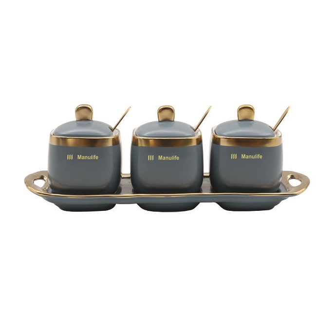 Bộ hũ gia vị được thiết kế đồng bộ gồm khay đỡ chắc chắn và 3 hũ sứ có nắp, muỗng riêng từng hũ. Viền mạ vàng và phối màu hiện đại giúp sản phẩm vừa tiện dụng vừa mang tính thẩm mỹ cao.