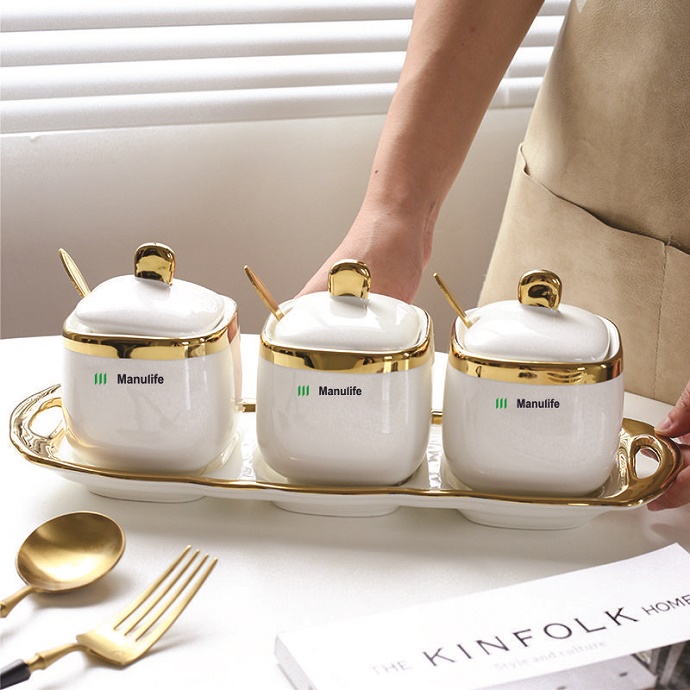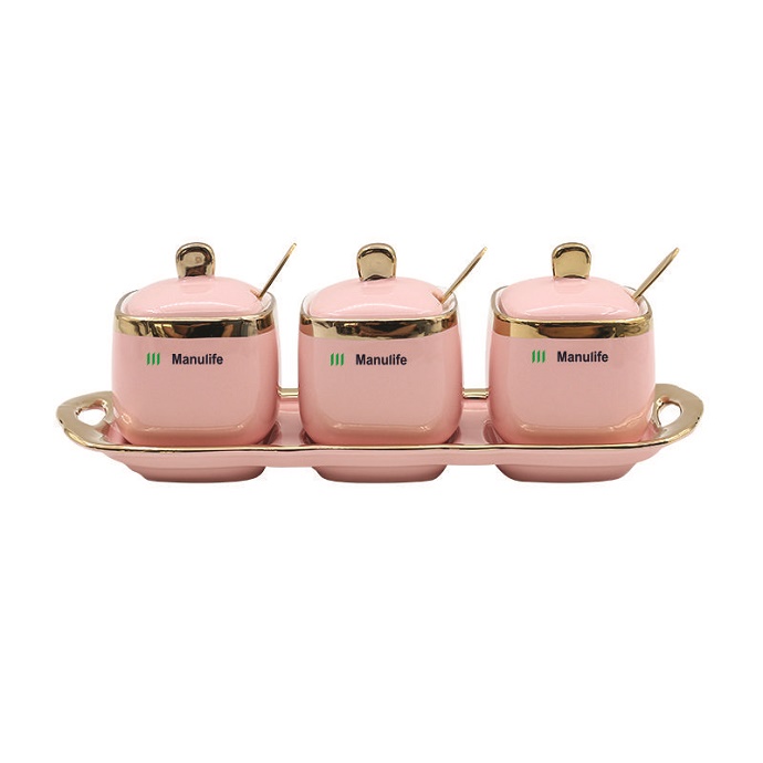 Bộ khay đựng gia vị cao cấp gồm 3 hũ sứ có nắp và muỗng đi kèm, thiết kế sang trọng với viền mạ vàng nổi bật. Sản phẩm phù hợp sử dụng trong gia đình, nhà hàng hoặc làm quà tặng doanh nghiệp cao cấp.