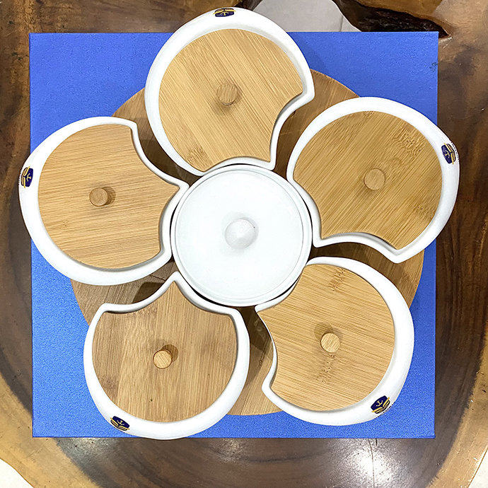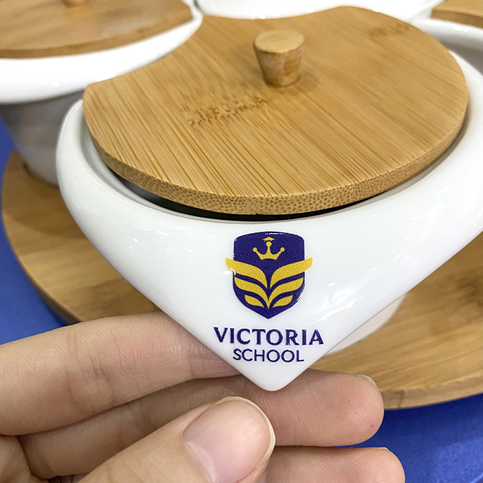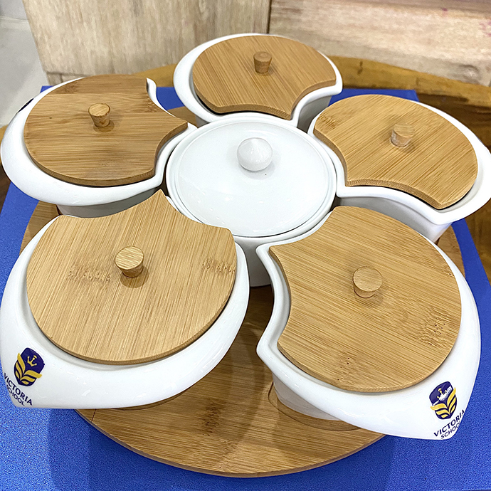 - Khay mứt hình sò in logo trường học, khay mứt 6 ngăn khá tiện dụng đựng bánh kẹo ngày Tết đẹp, sang trọng.