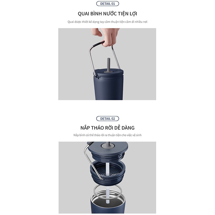 - Tay cầm giúp bạn có thể thuận tiện mang theo mọi lúc mọi nơi, nắp có thể tháo rời dễ dàng vệ sinh, miệng bình rộng đủ để vệ sinh bên trong và thêm đá viên.