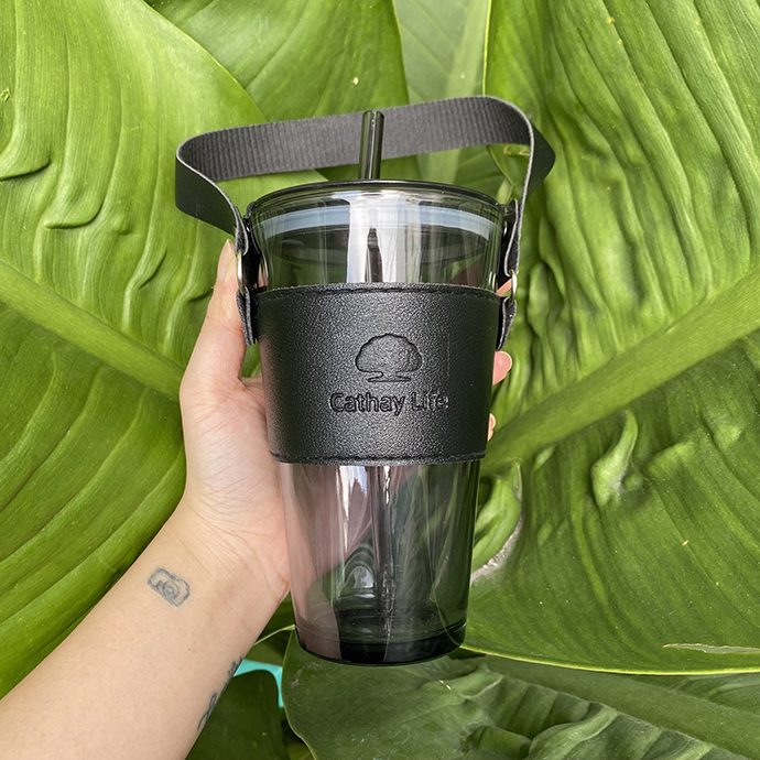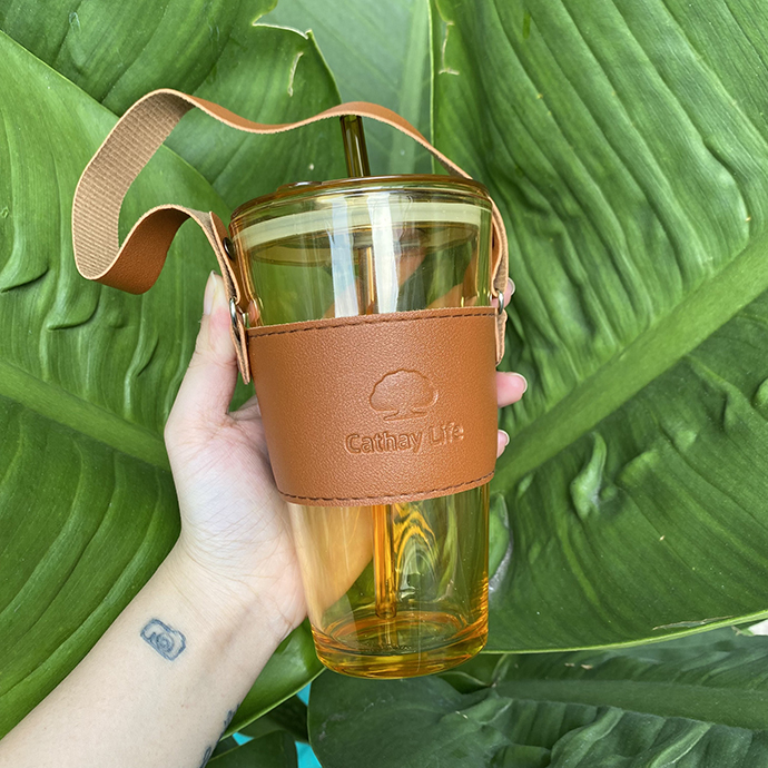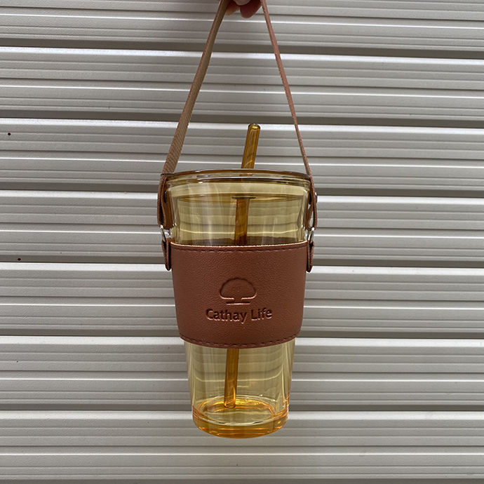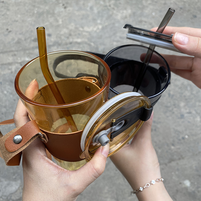 - Cốc thủy tinh Gorgous có nắp, ống hút và bao da đi kèm.