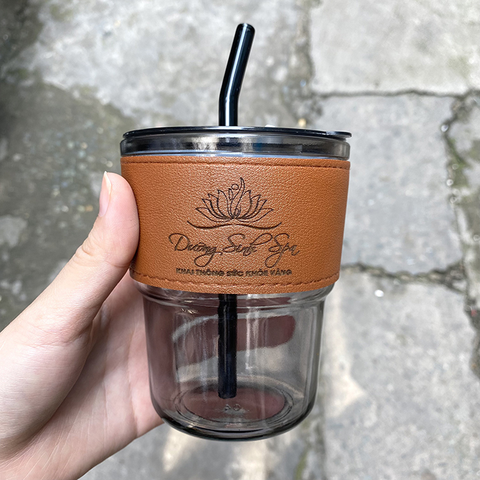 - Cốc thủy tinh có nắp, ống hút và bao da đi kèm.