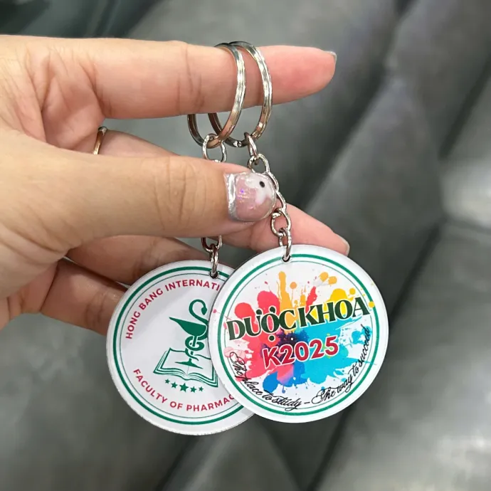 Mỗi chiếc móc khóa được in hai mặt rõ nét: một mặt thể hiện logo trường hoặc khoa, mặt còn lại in khẩu hiệu, tên lớp, hoặc năm học. Kiểu dáng tròn thanh lịch, dễ mang theo.
