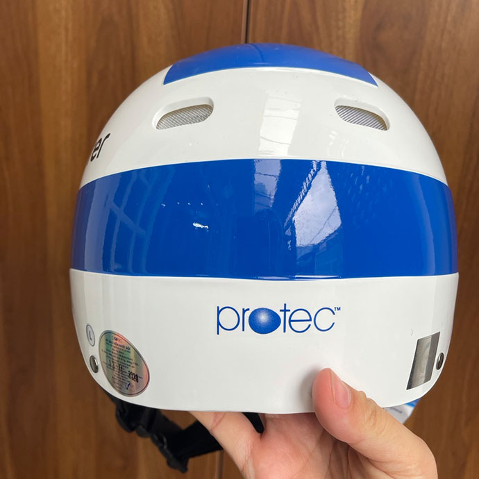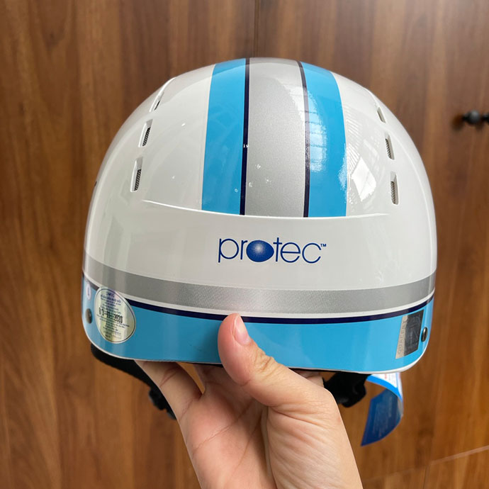 Nón bảo hiểm có kiểu dáng nửa đầu nhỏ gọn, phối màu xanh – trắng nổi bật, mang lại cảm giác trẻ trung và năng động. Logo thương hiệu được in theo yêu cầu trên bề mặt nón, tạo ấn tượng mạnh mẽ khi sử dụng ngoài trời.